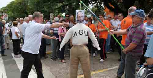Aerus: Aposentados protestam e queimam Judas nos aeroportos09/11/2012 - Transportando O boneco representava o ministro-chefe da Advocacia Geral da União, Luís Inácio Adams. |
