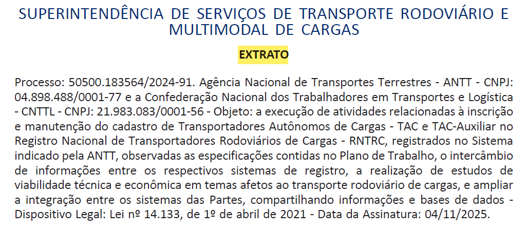 Uma boa notícia para os cerca de 600 mil caminhoneiros autônomos do país. A CNTTL (Confederação Nacional dos Trabalhadores em Transportes e Logística) e a ANTT (Agência Nacional de Transporte Terrestre) firmaram no último, dia 4 de novembro, um acordo de cooperação técnica (ACT).
