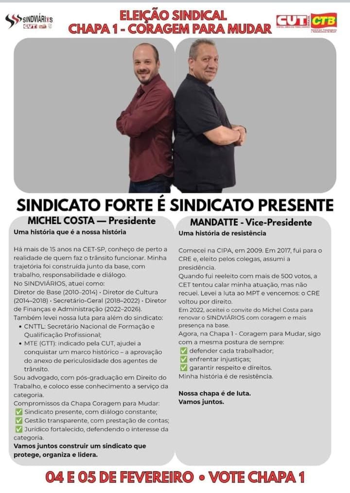Para a CNTTL, a Chapa 1 encabeçada pelo companheiro Michel fará uma gestão de luta e com compromisso com as lutas dos trabalhadores agentes de trânsito. "Participe da eleição, vote chapa 1 nos dias 4 e 5 de fevereiro", reforça a Confederação.